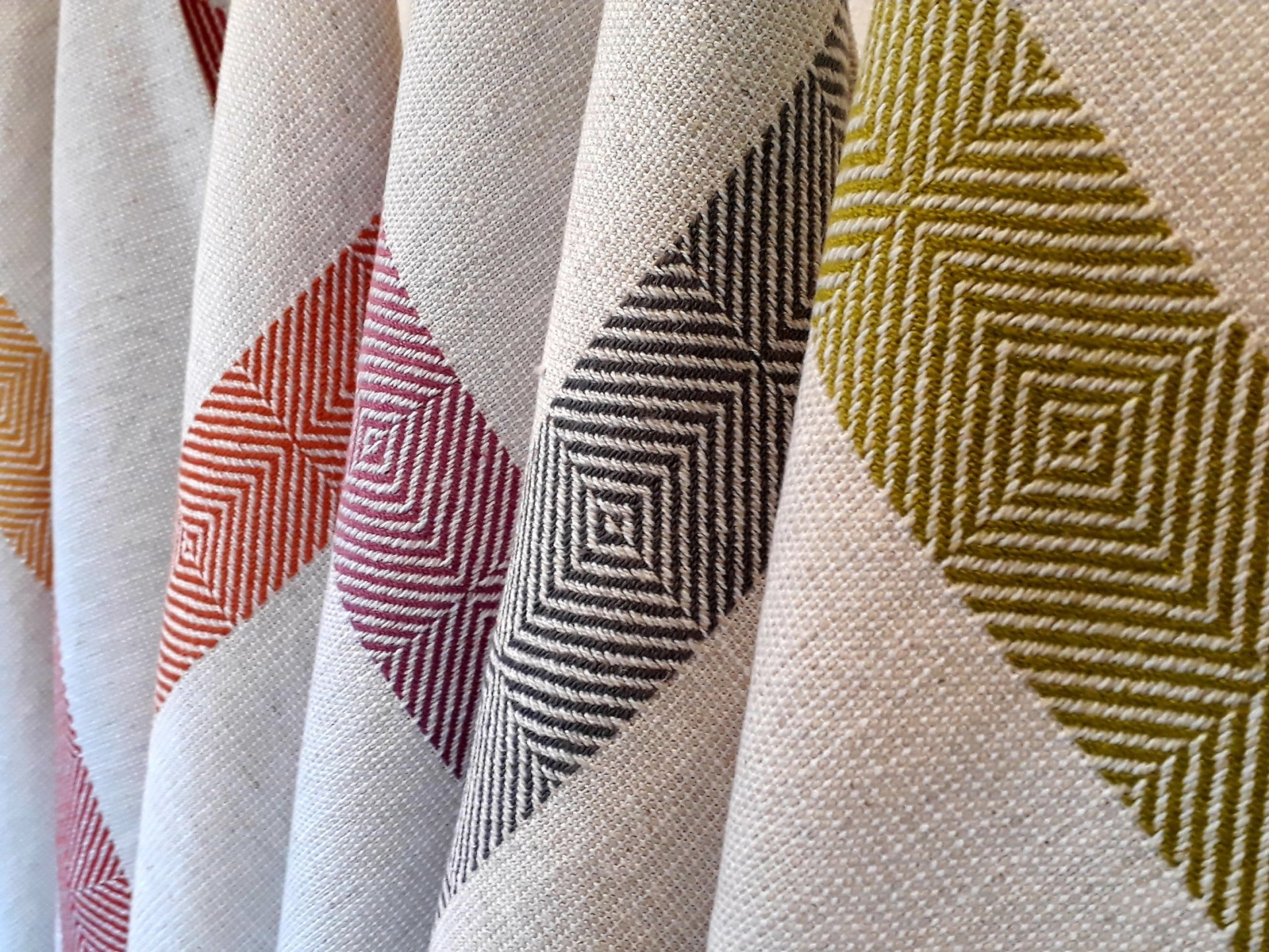 • Leinwandbindung natur, je 2 Streifen Fischgrät farbig